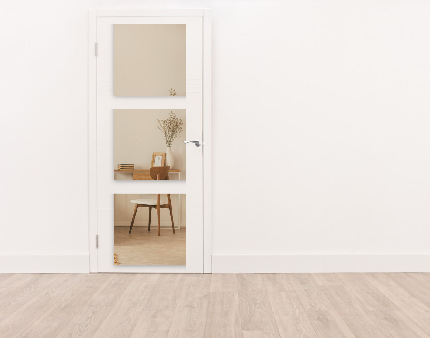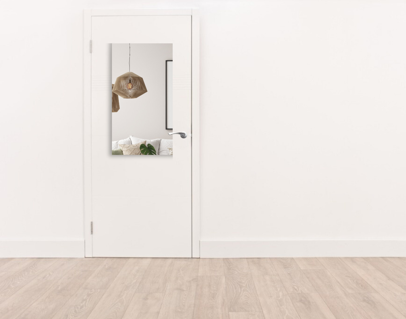 kleding goed zit. Dit is allang niet meer het geval want momenteel is een spiegel in het interieur niet meer weg te denken als woonaccessoire. Deurspiegels zijn in willekeurige ruimtes toe te passen. Denk bijvoorbeeld aan een spiegel die je op een deur plakt in je slaapkamer, woonkamer, overloop, entree enz. Een deurspiegel geeft sowieso een ruimtelijk effect, waarbij het uitermate geschikt is de deurspiegel toe te passen in een kleinere ruimte. Onze spiegels worden zonder omlijsting geleverd waarbij de eventuele lijsten op een afbeelding ter inspiratie zijn.
