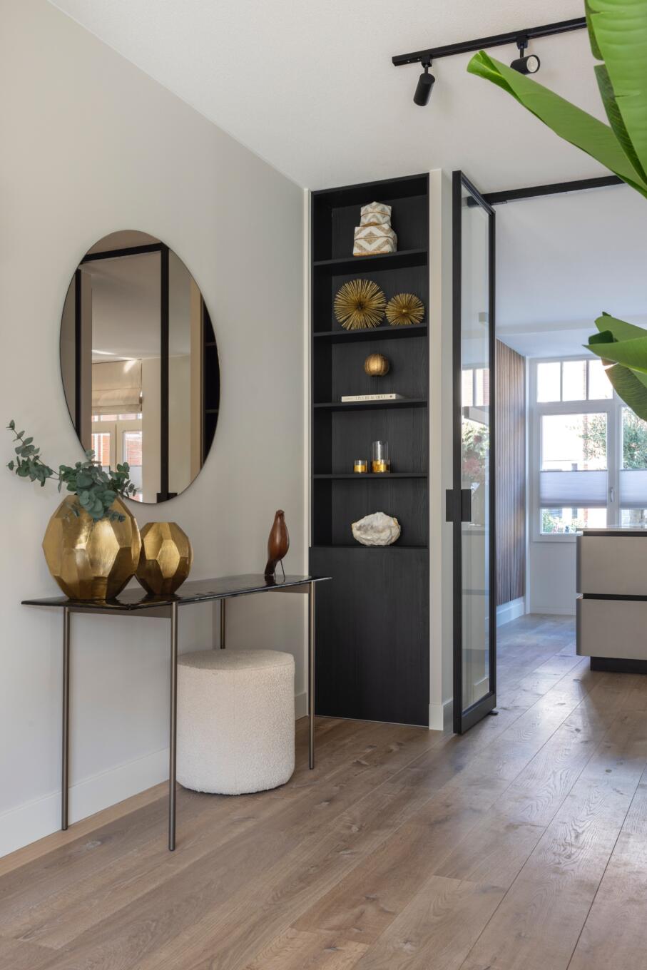 Runder Spiegel in Bronzefarbe, an der Wand im Wohnzimmer hängend