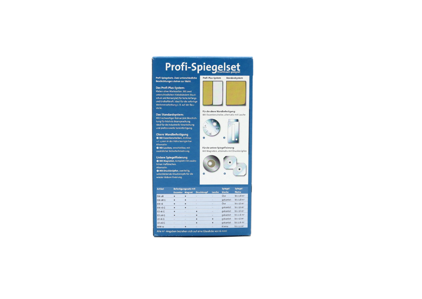 Let op: voor de bevestiging / montage van veiligheidsspiegels (fitness spiegel, dansspiegel), zijn de spiegelmontage sets ED08, ED16 en ED26 niet geschikt. Dit i.v.m. de veiligheidsfolie die achterop de spiegel is aangebracht, waardoor een blijvende hechting met de bevestigingsmaterialen niet gegarandeerd kan worden.