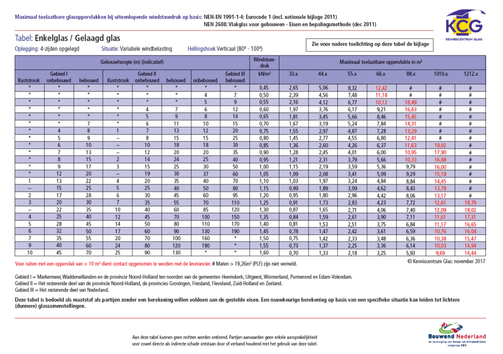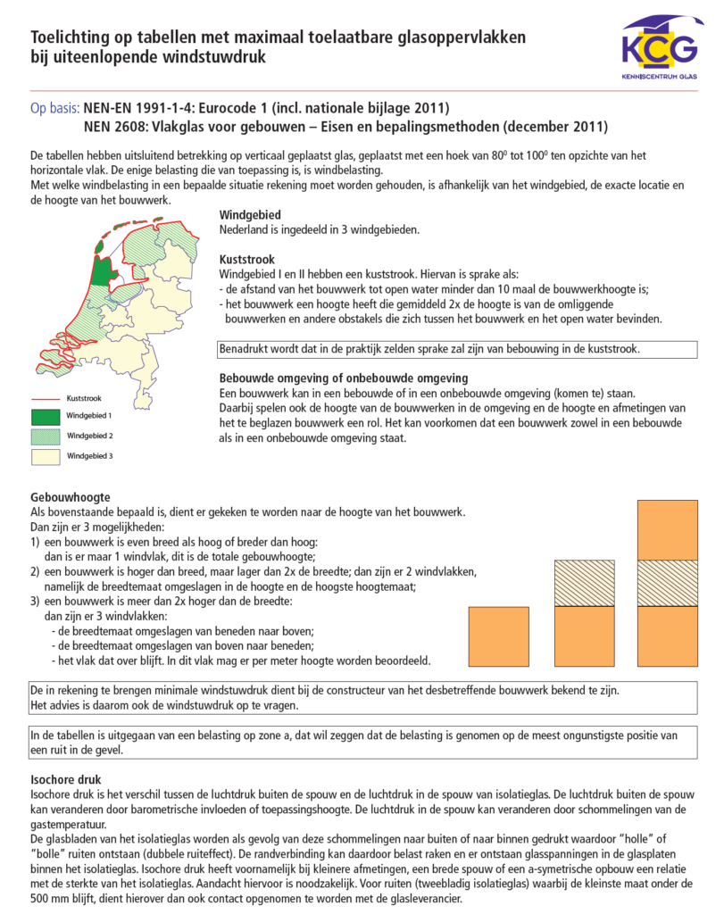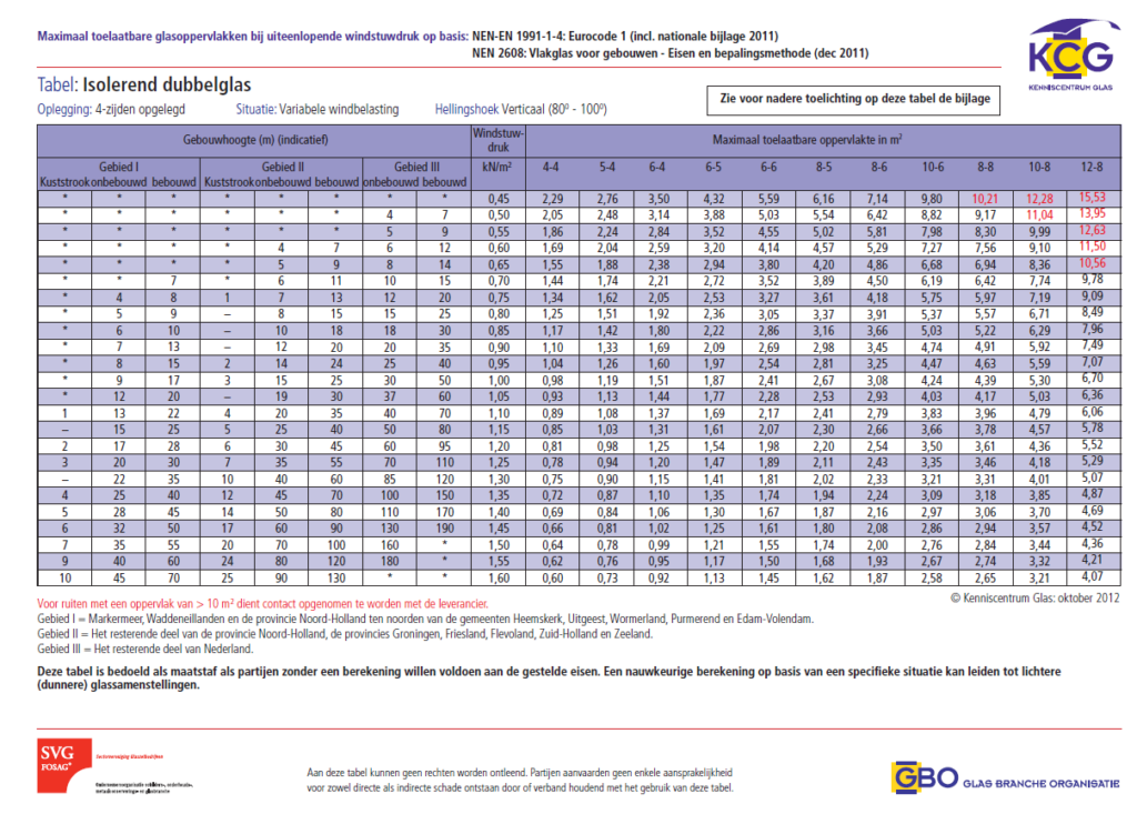 Onderstaande tabellen geven de maximale windlast berekening glas weer bij dubbelglas, enkel glas en gelaagd glas. Naast de indeling van de windgebieden, zijn de factoren bebouwd, onbebouwd en kuststrook relevant. Lees daarom de onderstaande toelichting voordat je overgaat tot het bestellen van gewenste glas. Uiteraard is dit slecht een indicatie c.q. advies. Het inschakelen van een bouwkundig/glas specialist die ter plaatse de situatie beoordeelt kan tot een andere conclusie komen. De onderstaande tabellen zeggen niets over de normering ten behoeve van veiligheidsglas (NEN3569), dus daar waar de situatie vraag om letselveilig glas toe te passen. Alleen de windlast en het bijbehorende glas is hier te vinden.